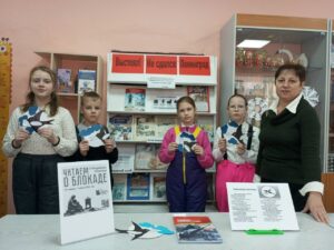 В рамках акции для учащихся прошёл тематический час «Жизнь, деленная на граммы». В ходе мероприятия библиотекарь рассказала ребятам о тяжелых испытаниях, выпавших на долю жителей осажденного закрытого города Ленинграда. Прочитали рассказы С. Александрова «Южное яблоко», Т. Кирюшатова «Блокадная ласточка». А затем ребята сделали поделку ласточку с письмом в клюве образец жестяного значка. Этот знак стал ответом на заявления фашистов о том, что теперь в город даже птица не пролетит. Таким образом, жители осаждённого Ленинграда показывали, что ждут хороших вестей с фронта, что не теряют связи со страной. «Блокадная ласточка» — символ надежды на лучшее, на скорую встречу с родными и близкими. Позже ласточки стали живыми символами надежды блокадного города. Сделав аппликацию, ребята почтили память героев, лучше поняли и запомнили эту важную историю.